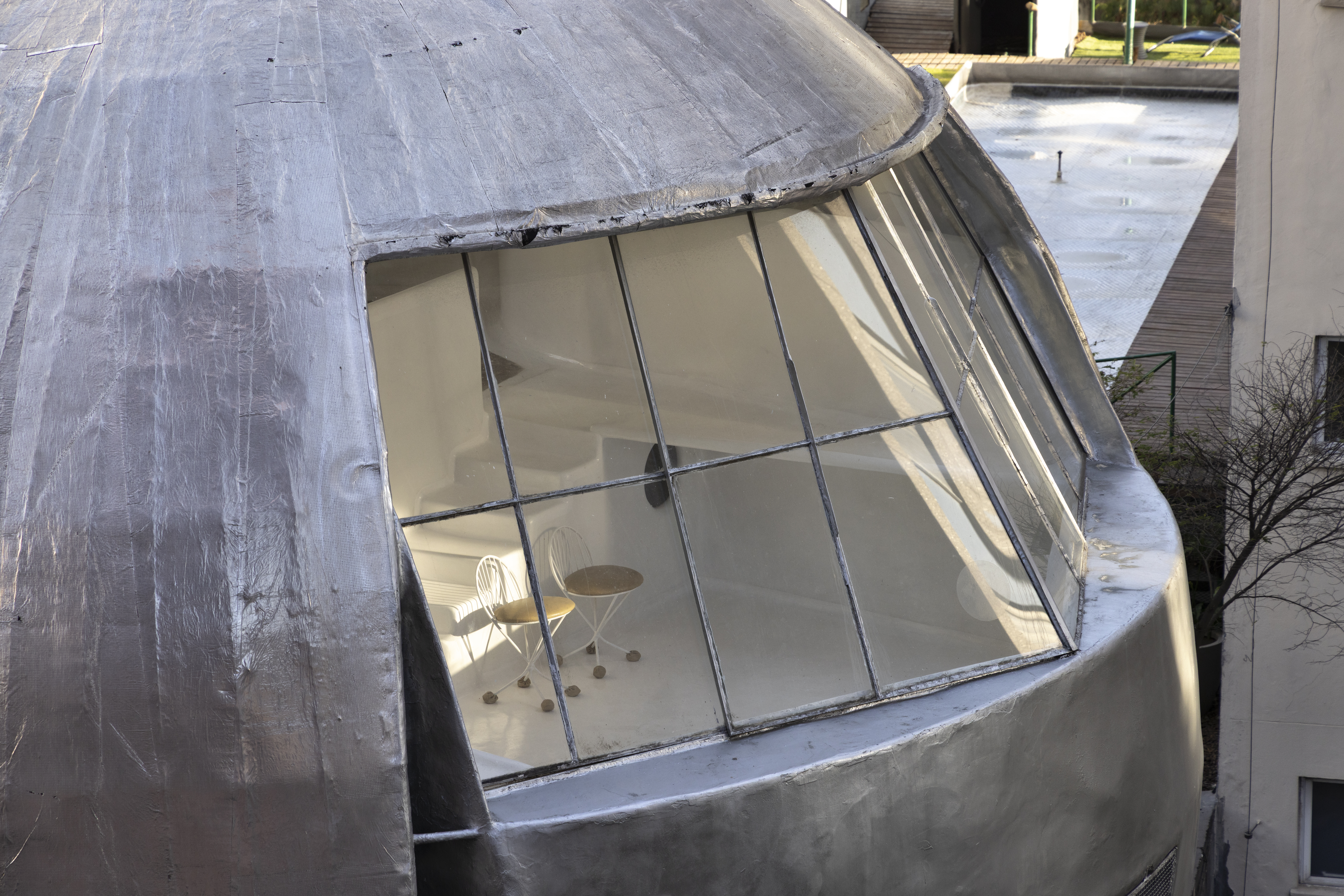 A Casa Bola, concebida a partir de uma maquete provisória instalada sobre sua própria casa e escritório. O experimento, inicialmente precário, permitiu testar as potencialidades estruturais da forma esférica e consolidar técnicas inovadoras que resultariam em uma residência singular. De estrutura temporária em lona, o projeto evoluiu para uma construção definitiva em argamassa armada — material leve e resistente, frequentemente empregado na indústria naval. A lógica construtiva estende-se aos interiores, onde arquitetura e mobiliário compartilham o mesmo princípio material e estrutural. A espacialidade, marcada por uma estética essencial, predominantemente branca e despojada de ornamentos, reforça o caráter experimental e prospectivo da obra.