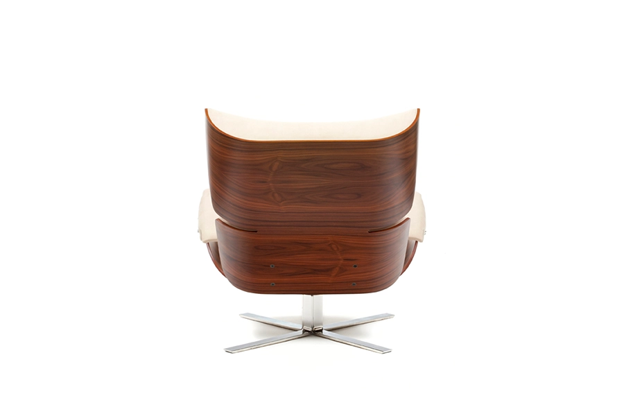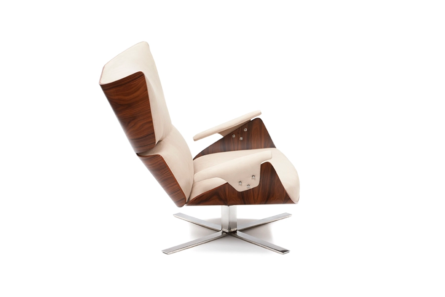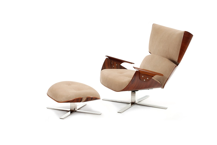 A base metálica, o apoio para os pés e a as porções fartas de revestimento são um convite para o descanso. O desenho, a aparência e o conforto dessa poltrona seguem os mesmos preceitos da obra do designer.